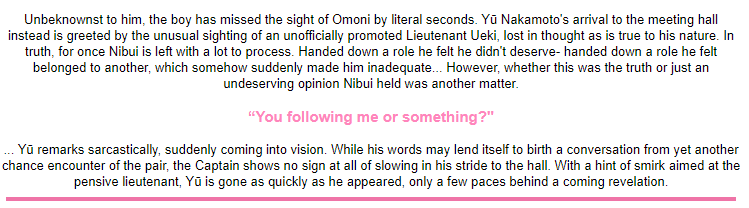 Upon his own arrival, he references their last interaction two weeks ago outside of the Captain’s Hall, and yet again it seems the two meet in a situation the Captain did not anticipate on seeing him. Assuming Nibui to be one who would much rather spend his day lounging about, Yū is sure he has been dragged here thanks to Omoni herself, projecting her intense thirst for combat onto her subordinates. Unlike before, there is an actual moment for the 11th lieutenant to reply whether it to be explain himself or deliver a taunt in return.