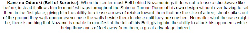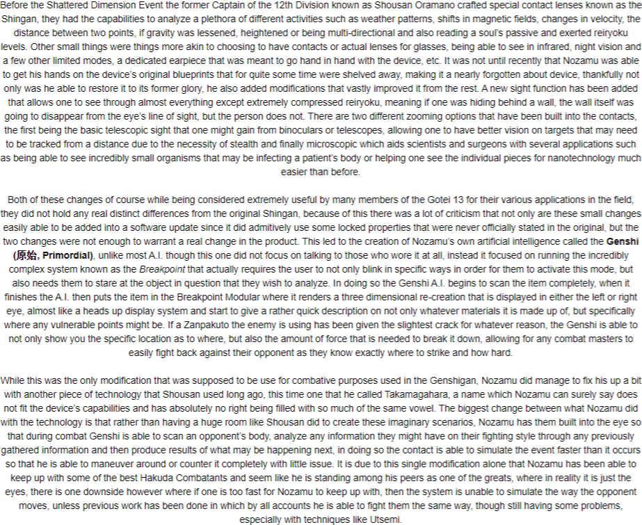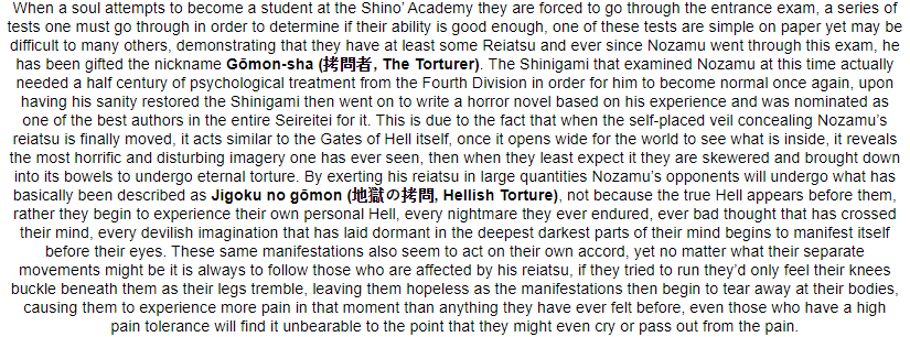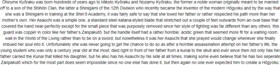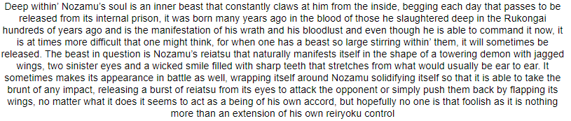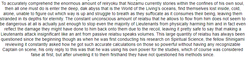 High Spiritual Power- Rin commands an unbelievable level of spiritual power. It is the source of energy for her vast abilities. When released, this crystal purple spiritual pressure is capable of ripping apart solidified structures as if they were made of tissue paper, bringing even Vice-Captain-class individuals to the ground if they fail to defend themselves properly. Even then, her Reiatsu is the embodiment of regret. Those without superior souls may find themselves unable or even unwilling to keep up their defenses, which can be fatal due to the ripping and crushing nature of the released energy. While it is not truly limitless, this power is functionally perpetual, and outside of peculiar circumstances it can fuel Rin's abilities for as long as she needs to use them. Only during her Shikai or when she loses control does it fully expand, causing untold damage to herself and direct surroundings.