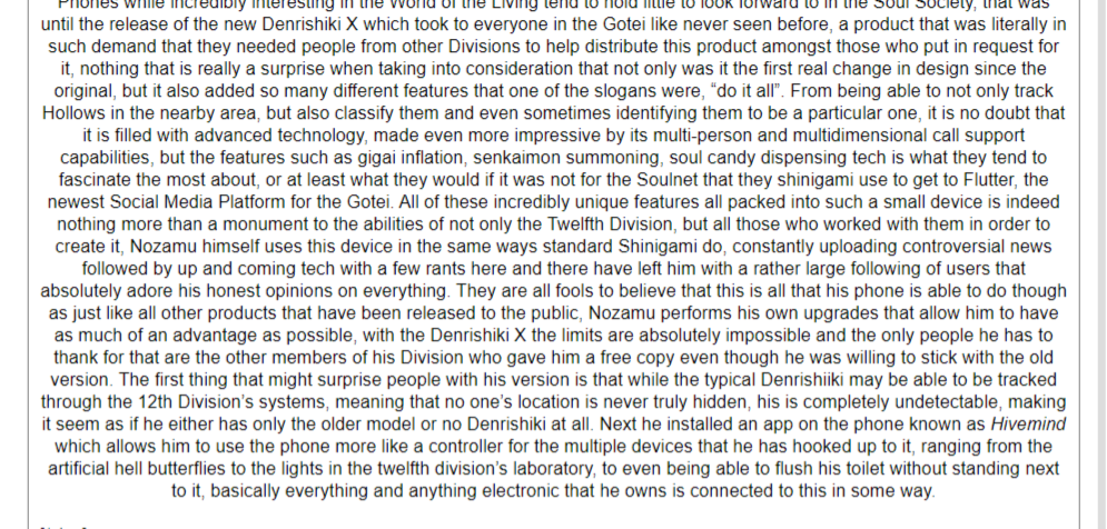 Equipment: Gigai, Soul Phone, Reinforced Gloves: The black gloves that Rin wears on her hands serve more than just one function. Formidable weapons designed by 12th Division's Nozamu Kyōraku had invented, to give the Enigma of Pain an offensive edge over the Hollow and any Shinigami that she is destined to fight. Each thread of the gloves was created by twisting together strands of lightweight silk and lab-made carbon filaments, along with a unique and powerful material—spiritual threads torn from the red soul ribbons of Shinigami The Reiraku (霊絡, Spirit Coils; "Spirit Ribbons" . The resulting composite is so durable that Rin can use an open palm to stop a Captain-level technique, or grab hold of a released Zanpakuto without risking injury. While wearing the gloves, her punches, fearsome enough to pummel through concrete, barely scuff her knuckles. But their true power comes from the specific advantage that they give against Shinigami and Hollow/Arrancar. Prolonged contact with the material is poisonous to Spiritual Aware Beings, sapping their spiritual energy and releasing it into the atmosphere. This, combined with Rin's incredible, pain-ignoring fortitude, makes her an absolute nightmare for Spiritual Beings who find themselves gripped by her hands. Without the ability to feel pain, it is virtually impossible to make her let go, and such has been the fate of most of the otherworldly guardians that have had the grave misfortune of getting in her way. Rin counter acts this Poison herself by taking a specifically designed antidote, the 12th Division's Nozamu Kyōraku also created this.