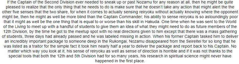 Expert Strategist and Tactician: Rin may not be the most intelligent Shinigami, but her far above-average mental capacity, combined with her stringent study of tactics, affords her a great deal of skill when it comes to strategic thinking. Her ability to plan ahead and coordinate with the members of her division has been an essential part of many great operations, and it remains a pivotal factor in the function of the Gotei 13. In battle, this tactical ability allows her to analyze her opponents through their movements, drawing on her knowledge of combat and swordplay to predict their intent and adjust her own stances to compensate for strengths and weaknesses. She can plan many steps ahead and adjust her strategies on the fly, giving her an advantage against simple opponents who prefer hacking and slashing. Many would-be rivals have fallen to her sword due to her planning and tactics, and the survivors know just how intelligent she really is.