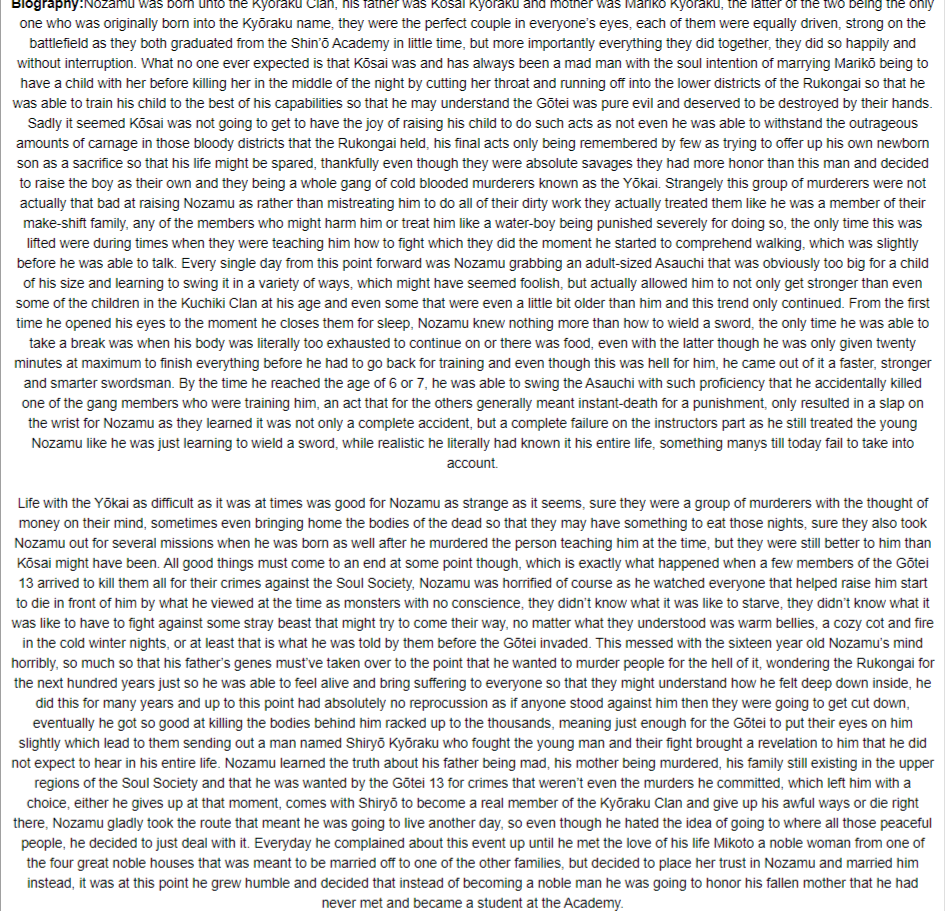 Enhanced Endurance: Like most other Shinigami, Rin can endure massive amounts of physical damage before succumbing to the pain, falling unconscious, or dying. Her body can withstand injuries that would immediately kill or incapacitate a normal human, such as a ruptured organ or a lost limb, without shutting down. This allows her to continue fighting through otherwise impossible conditions, and it also contributes to her ability to withstand the incredible spiritual pressure that sometimes accompanies intense combat. Although she cannot regrow her limbs or heal grievous wounds without the help of skilled medical Kido, Rin can fight through the pain without showing it on her face, which can be very unsettling to weaker opponents who would fail under similar constraints. She is resistant to poisons and toxins that would affect weaker individuals, and her skin, which is toughened by her Reiatsu, can block particularly feeble attacks without sustaining any visible damage. This is complimented by the scaring along her spin, preventing her to feel the damage done to her body as she pushes her limits even further beyond.