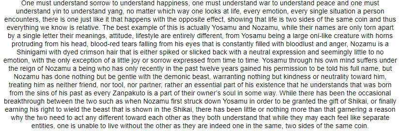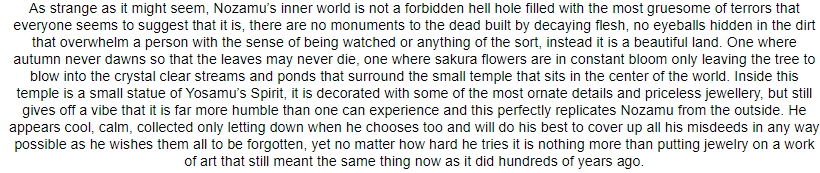 Her inner world represents the Ebb and Flow of life and death. A mirrored crystal clear and bottomless lake overlooked by vivid white clouds and deep blue skies. She always appears as if waking up from under the sole decoration, a large oak tree growing strong out of the water. Her zanpakuto spirit either comes from the still waters below or forms from the clouds drifting 10 feet above at the lowest points of the lake. The water goes on for eternity as the winds drift the huge white clouds in from above. However, if one was to look below the water long enough, their vision would clear and soon they would see a reverse world, with a pitch black sky and grey putrid clouds wafting below. Under the tree the roots eventually connect to their reflection, turning white and dead as they climb out of the black water into a blacker sky.