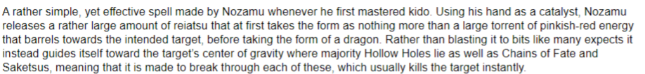 Specialist- Manifesting her reiatsu into pressure has come as second nature to her. Her training with Jinnosuke and constant verbal matches about how to actually become stronger have made her improve greatly, from her time in Shino Academy. Now she is able to formulate her reiatsu in way's that amplify her being and even stop lower ranked shinigami in their tracks.