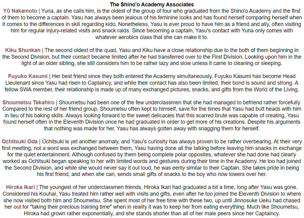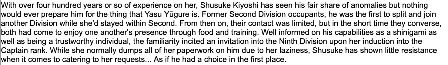 Shusuke Kiyoshi • Another academy mate of Musou’s, Shusuke is a man that he considers to be a close friend. The two of them crossed paths more often than not, and found similarities between each other whilst the aristocratic Kyoraku and Kiyoshi families often shared tea-times and other pointless gatherings. As this transpired, the two of them were working rigorously to risk their lives as Shinigami, leaving the life of a true nobleman behind. Shusuke is Musou’s game partner, the man that he plays Shoji with constantly. The two enjoy sharpening their minds, and having a battle of wits.