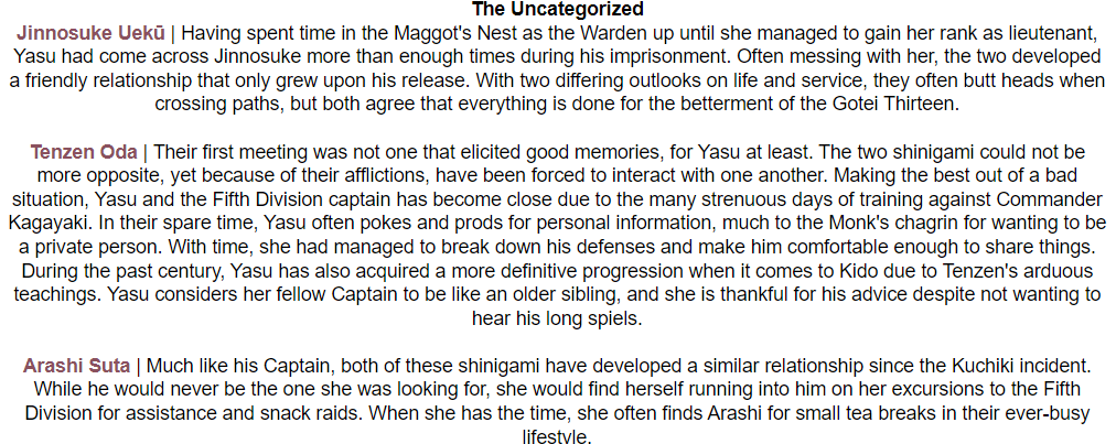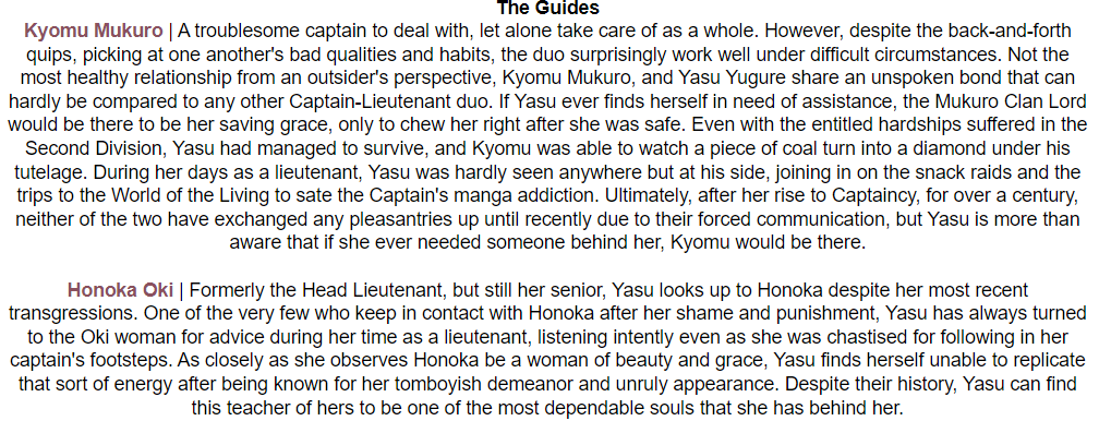Suiyo Kusotare • The Drunk Captain; Musou is not one to leave things unsaid. He does not lack expression, and this is perhaps the first thing the impoverished Captain discovered about him. He was clear in his thoughts about the man. Decrepit, idotic, foolish, foul-smelling, and drunk. His tattered clothes bathed in the stench of liquor were an uncommon and ungodly visage to take in by a man raised in privilege. In the beginning, their interactions consisted of the man spewing nonsense, and Musou ignoring it. As his ears opened to the man, so too did his heart. Beneath slurring words and putrid breath is an ingenious mind, finely in-tune with the world around him. Things he seems to say on accident happen to apply perfectly to a given situation, making him an amazing mentor with valued advice. Furthermore, his combat prowess cannot be ignored; Musou considers the man an equal in the art of the sword, but will never go far enough to call him his superior. Not only because he thinks it untrue, but because he refuses to give the man the satisfaction. Musou appreciates Suiyo as a brother-in-arms, his guidance valued above anyone else’s. When he’s not sleep, it’s not unlikely for him and Musou to be somewhere neglecting the not-so-entertaining duties that plague them in the 8th Division. They wander the Seireitei as a duo, looking for trouble to spur, or maybe friends to spar.